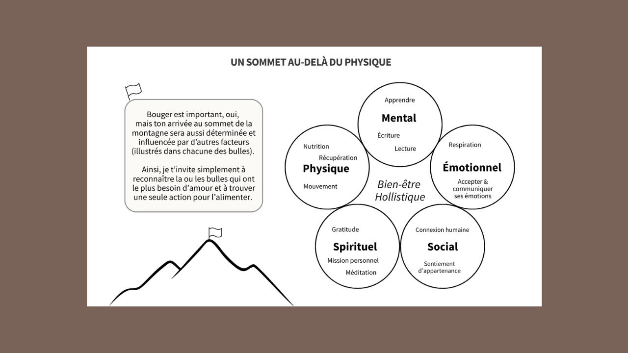Uun corps fort, c’est bien, mais un équilibre global, c’est encore mieux, surtout pour aller plus loin, longtemps.Ce guide t’aide à visualiser les cinq piliers essentiels de ton bien-être (physique, mental, émotionnel, social et spirituel) pour t’assurer que ta progression va bien au-delà du tapis.Tu y découvriras comment le mouvement conscient, la gratitude, la respiration et la récupération s’unissent pour t’aider à atteindre ton “sommet”, celui du corps et de l’esprit.