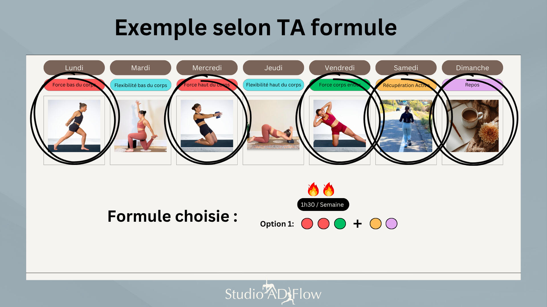 À chaque semaine, à l'aide de mon approche par niveau, je t'aide à choisir la formule d'entraînement la plus adapté à tes besoins selon ton énergie, ton temps et ta motivation.En moins d'une minute, tu sauras exactement quelle séance faire, quel jour, pour le planifier dans ta semaine et obtenir enfin des résultats.Il te reste juste à cliquer sur les séances de ta formule et c'est partie !