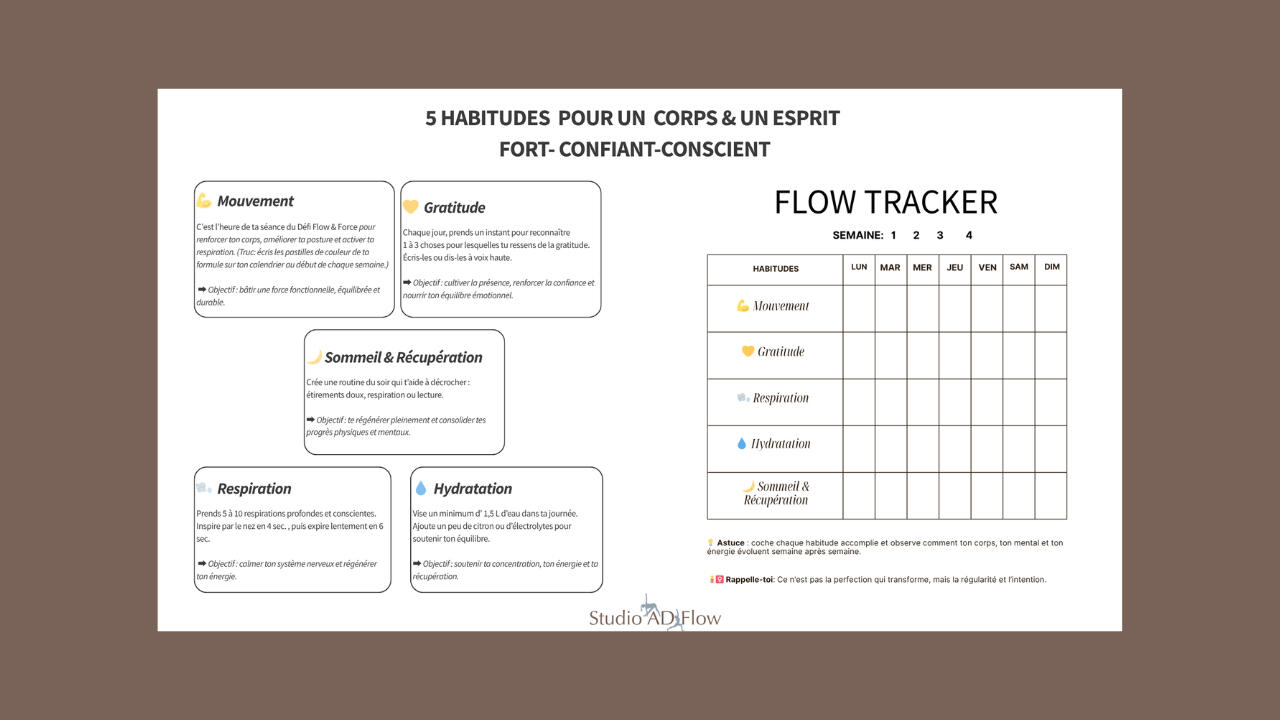 Flow & force est beaucoup plus qu'un simple programme d'entraînement, c'est une approche qui vise à soutenir ton bien-être à l'extérieur, comme à l'intérieur et ce à long terme.Et ceci part entre autre, de nos petites habitudes qui façonnent notre énergie, notre santé et notre équilibre. Pourtant, il n’est pas toujours facile de les maintenir.Le Flow Tracker est un outil simple qui a transformé mon quotidien, et qui pourra t’aider toi aussi à rester constant(e) dans tes habitudes pour optimiser ton bien-être global.Chaque jour, tu y suis tes habitudes de :