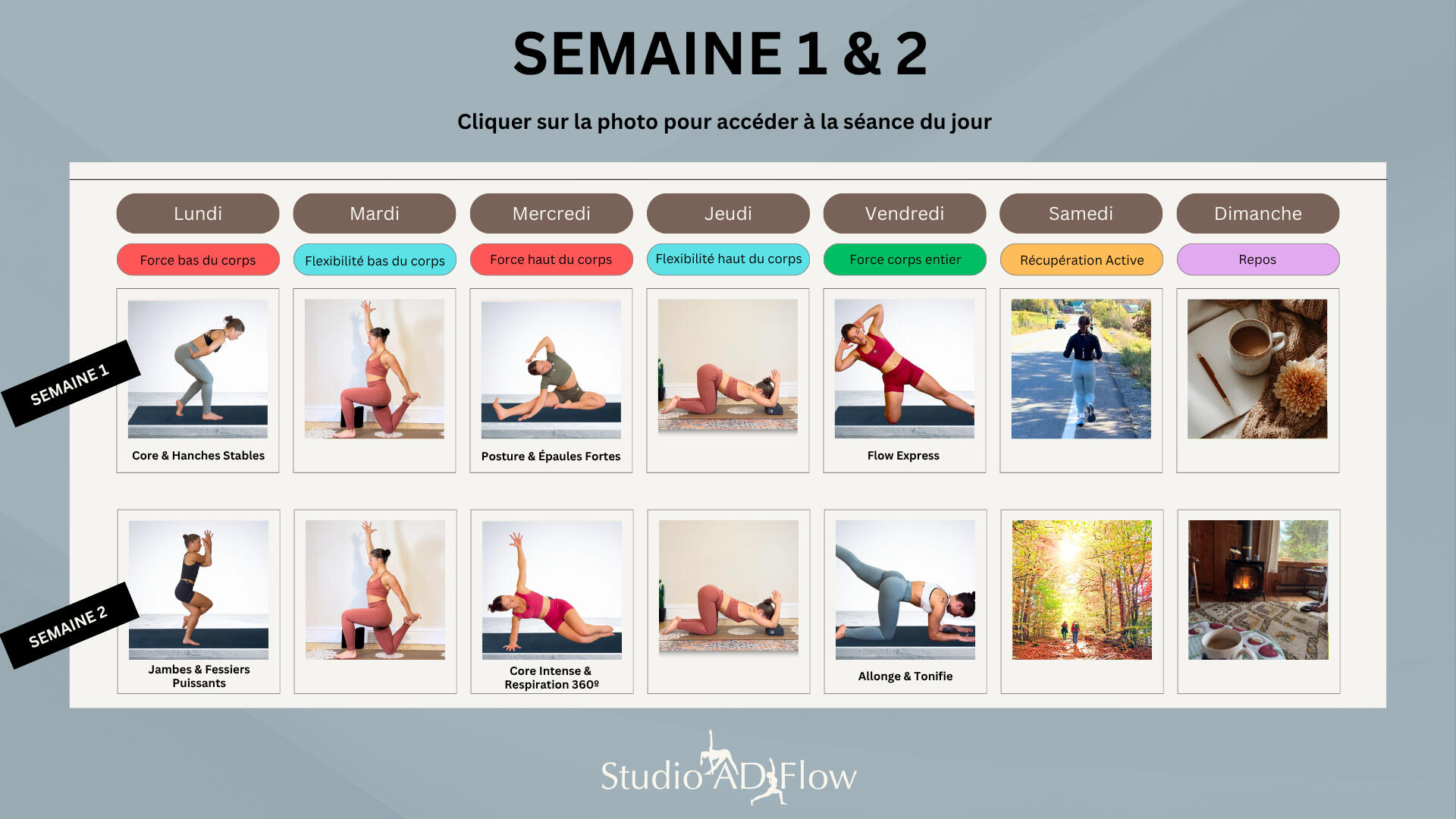 Peu importe où tu en es dans ton parcours, Flow & Force va transformer ta façon de bouger.Ce programme structuré de 4 semaines combine intelligemment Yoga & Pilates pour t’aider à bâtir un corps fort, mobile et équilibré, sans te surcharger ni te blesser.Chaque séance est soigneusement conçue selon la science du mouvement, de la respiration et de la conscience corporelle, pour que chaque minute compte. L’équilibre entre force, mobilité et récupération crée la progression idéale : plus d’énergie, plus de fluidité, plus de confiance.Flow & Force, c’est bien plus qu’un programme d’entraînement.C’est une approche hollistique qui te permet de renforcer ton corps, réguler ton mental et apaiser ton système nerveux, pour des résultats durables, de l’intérieur vers l’extérieur.Tu prendras plaisir à rester constant(e), parce que bouger deviendra enfin simple, fluide et motivant.🎥 Le programme inclut mes séances live enregistrées : tu profites de mon énergie authentique, de mes conseils spontanés et de l’ambiance réelle du groupe, comme si tu étais avec nous.